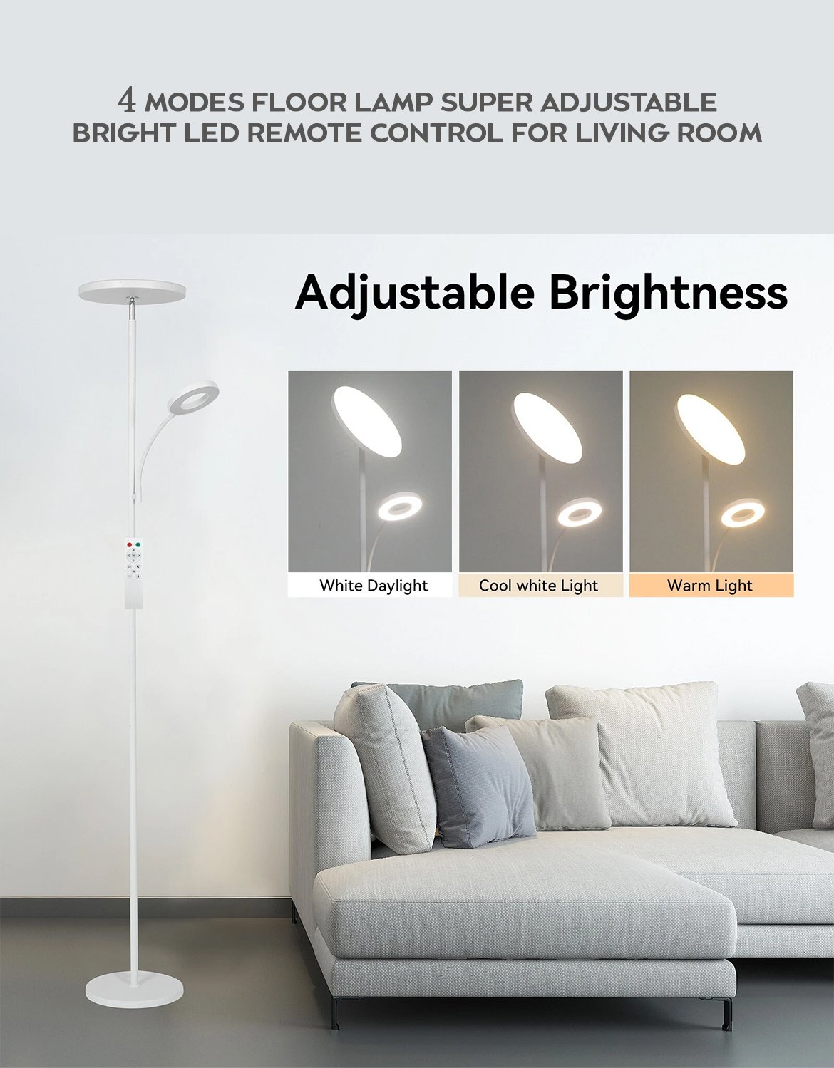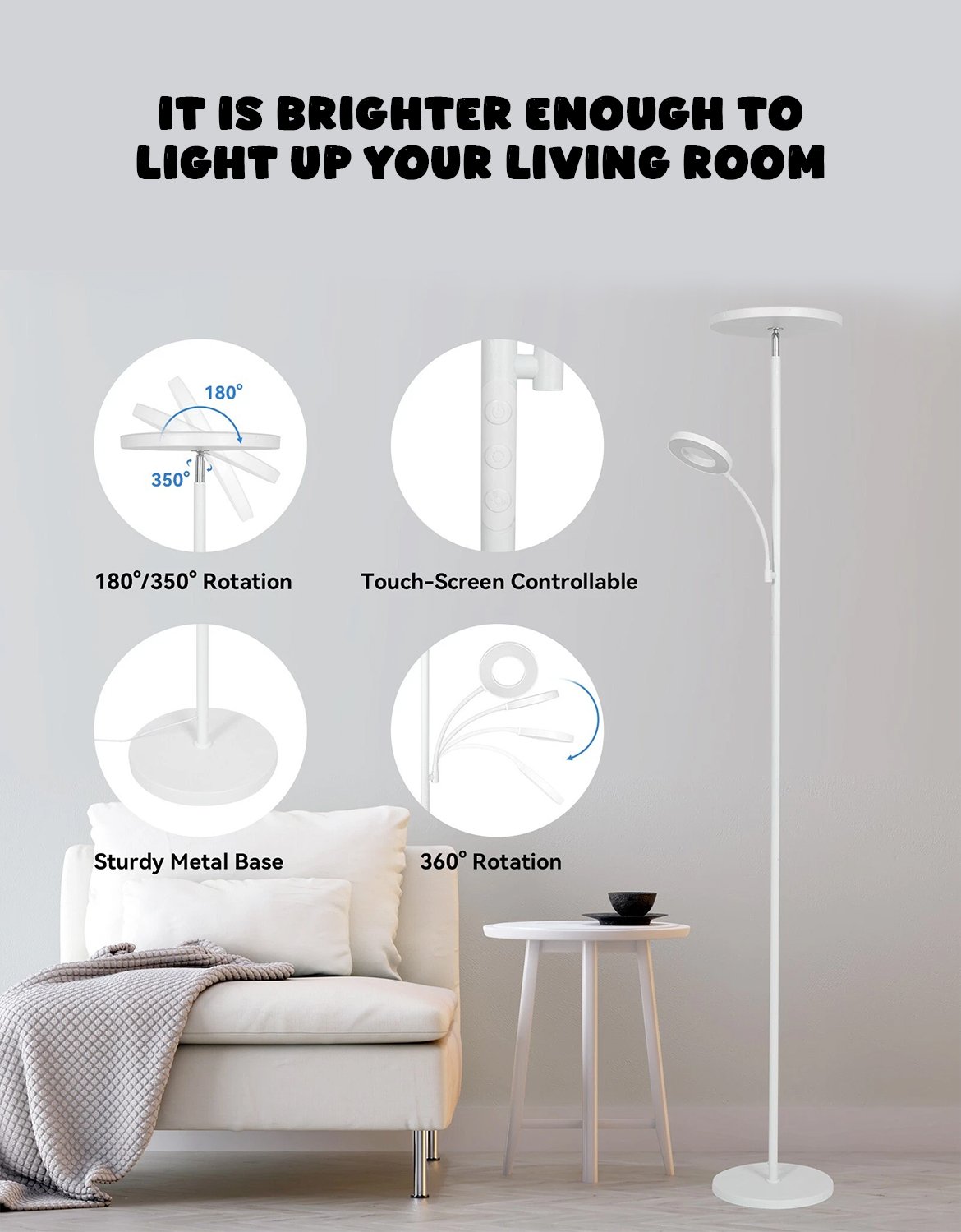 - 2024 UPGRADED SUPER BRIGHT TORCHIERE FLOOR LAMP: Our strong R&D team has upgraded the brightness and performance based on the same product on the market. Compared with other standing lamps with main lamp 27W/2350lm and reading lamp 5W/400lm, 126+22 LED beads, ours is 36W/3200lm and 7W/500lm, 132+28 LED beads. It is brighter enough to light up your living room.
